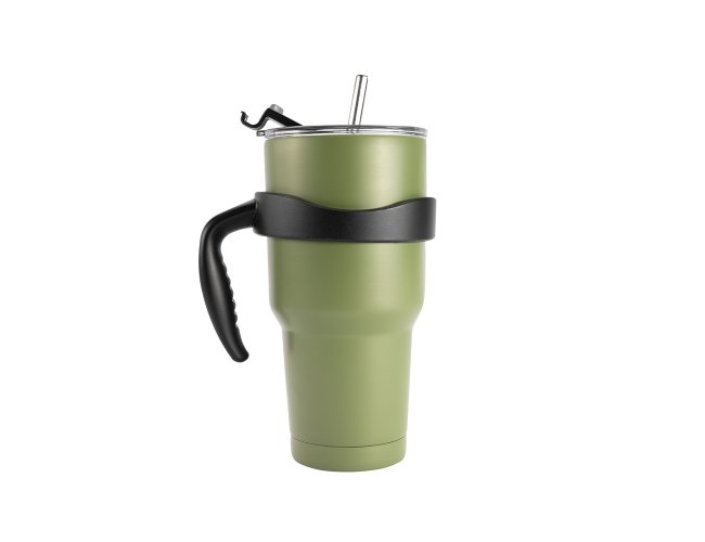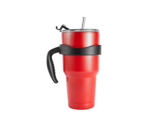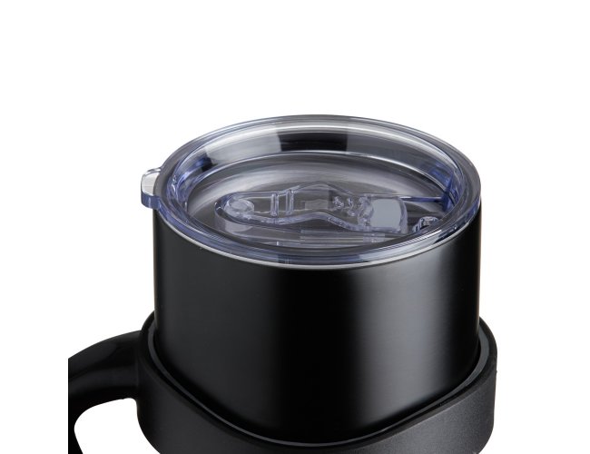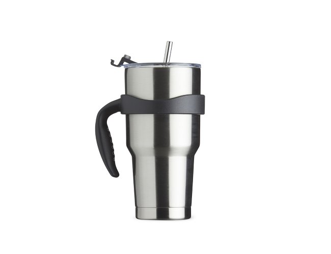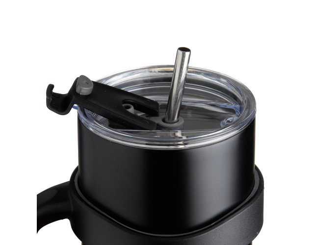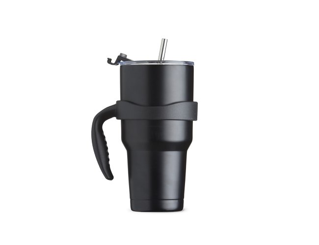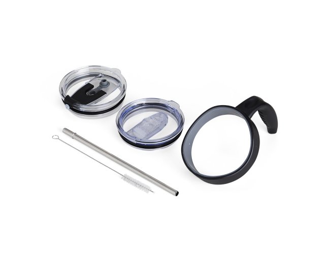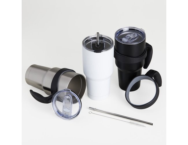 Caneca térmica de inox com capacidade para 800 ml, contém duas tampas, sendo uma acrílica com bocal, trava de segurança, e uma pequena tampa acoplada emborrachada para dissipação da temperatura, e a segunda tampa acrílica, contém compartimento que ao deslizar acessará ao bocal. Acompanha canudo de inox e escovinha de limpeza.
