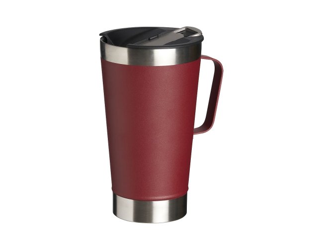 Caneca térmica de inox com capacidade para 500ml. Acompanha uma tampa de plástico e um abridor de garrafas. O abridor fica preso em um encaixe existente na tampa, porém é removível.