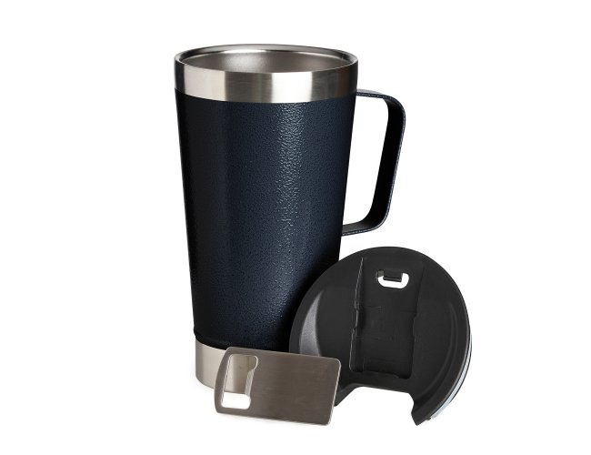 Caneca térmica de inox com capacidade para 500ml. Acompanha uma tampa de plástico e um abridor de garrafas. O abridor fica preso em um encaixe existente na tampa, porém é removível.
