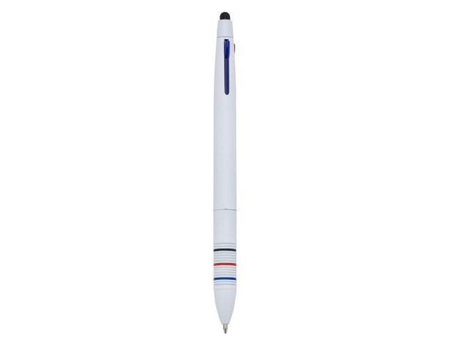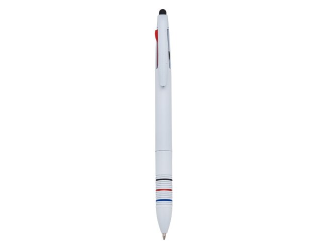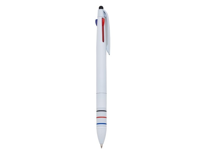 Caneta plástica 3 em 1 com touch screen, cargas esferográficas 1.0 mm nas cores: azul, preto e vermelho.