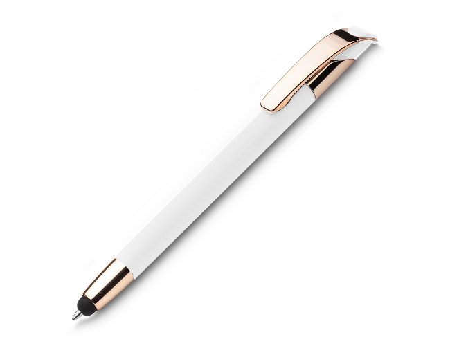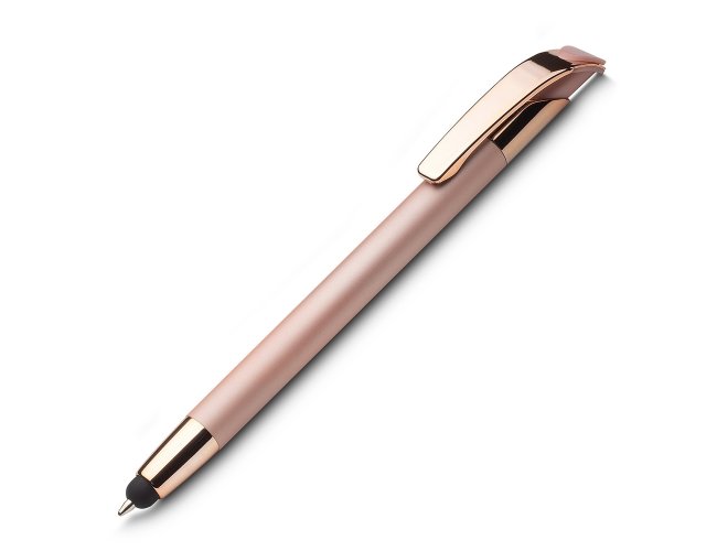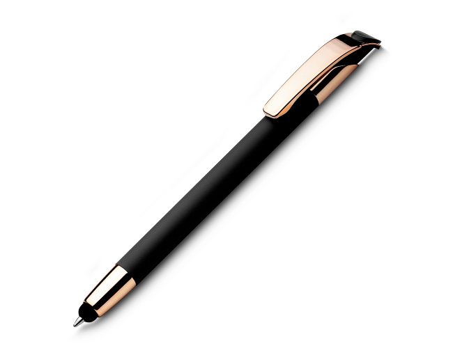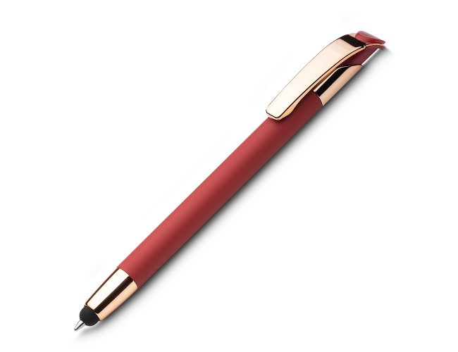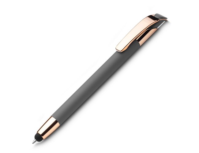 Caneta touch screen em alumínio reciclado com acabamento similar à borracha. Acionamento por clique e carga esferográfica azul 1.0mm.