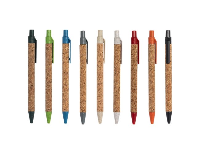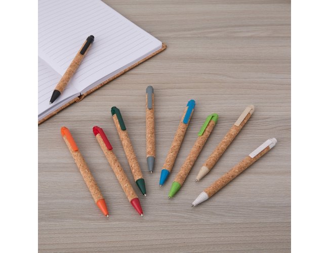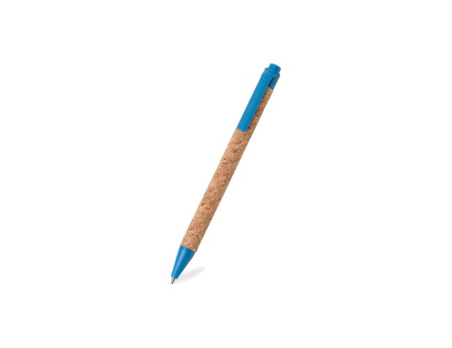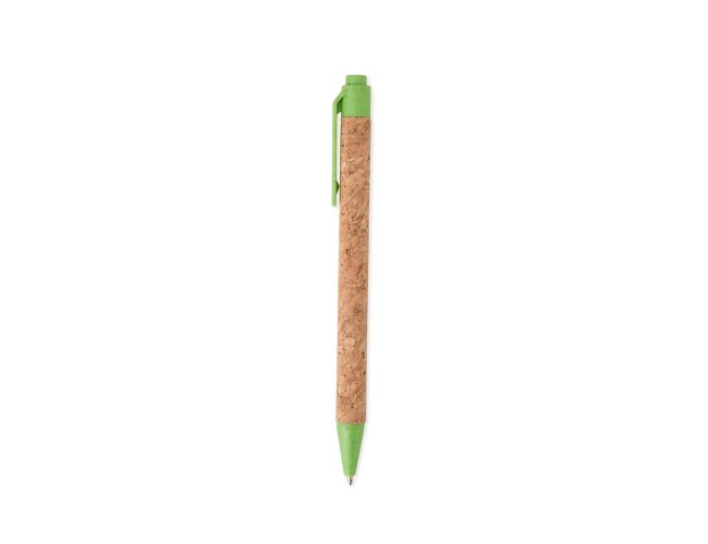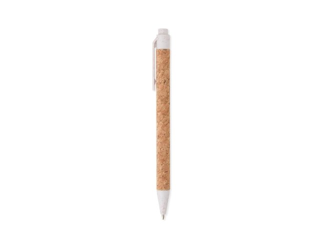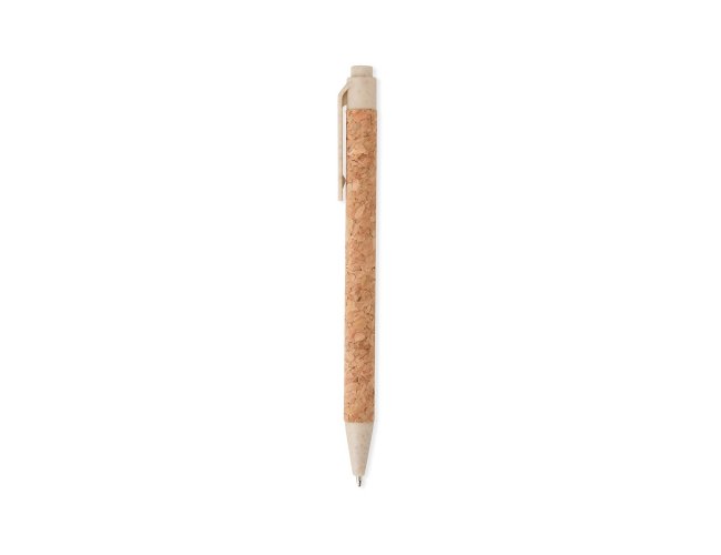 Caneta de cortiça com detalhes em palha de trigo, carga esferográfica azul 1.0mm e acionamento por clique.