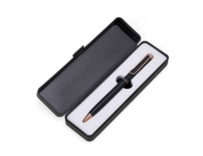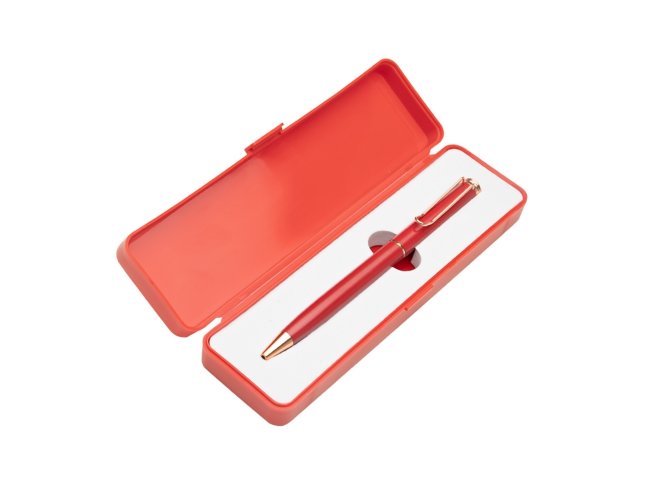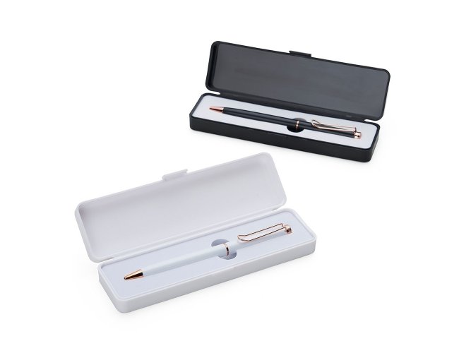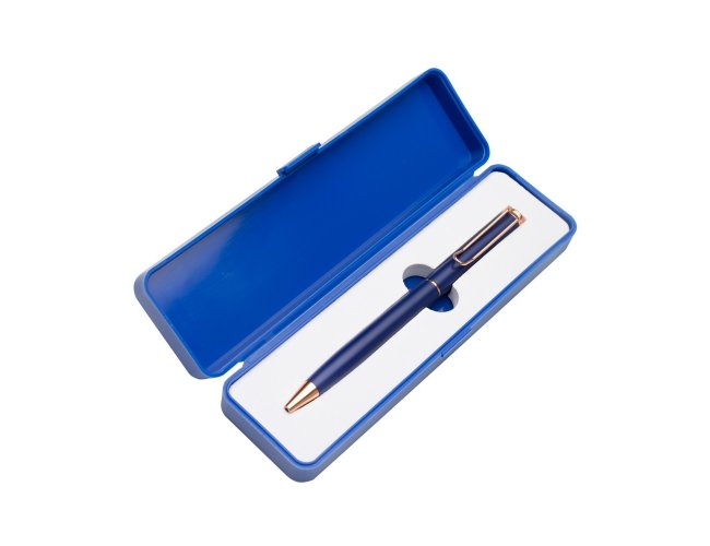 azul e acionamento por rotação. Conjunto caneta metálica com estojo de plástico e berço espumado. Carga esferográfica