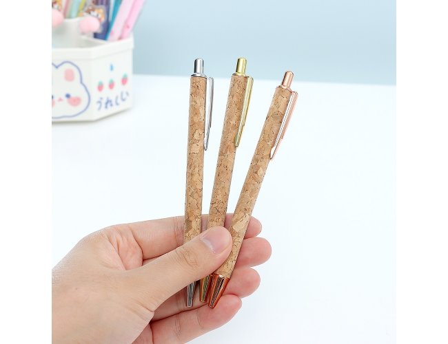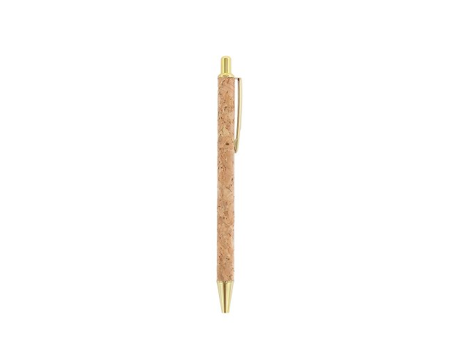 Caneta de cortiça com carga esferográfica azul 1.0mm e acionamento por clique. Clipe metálico, acionador e ponteira plástica.