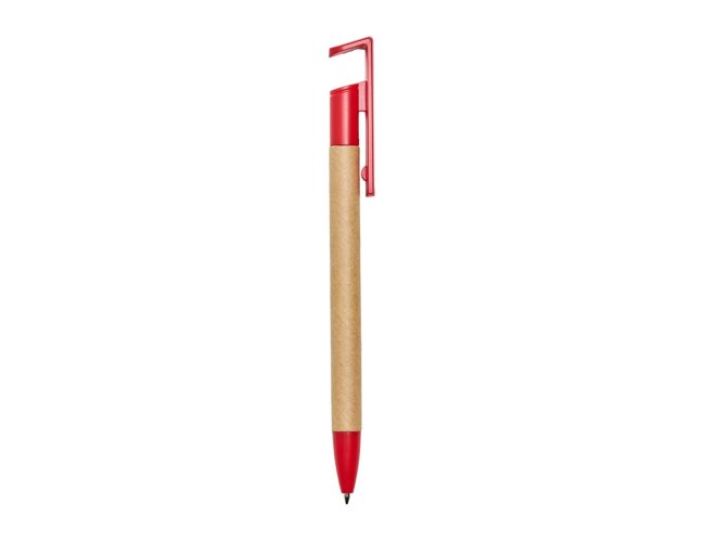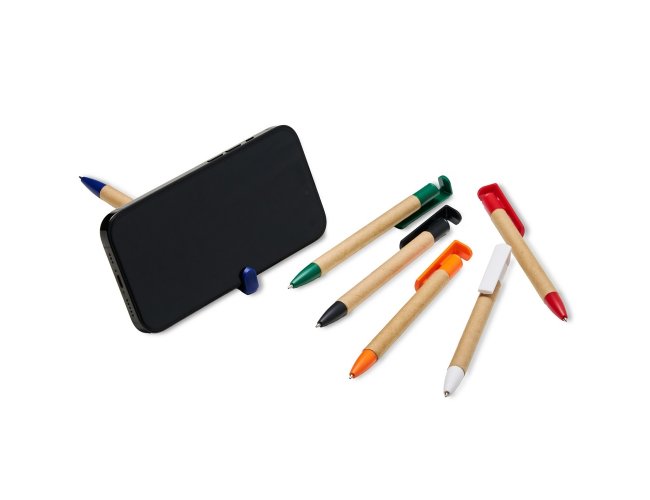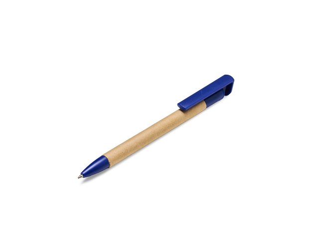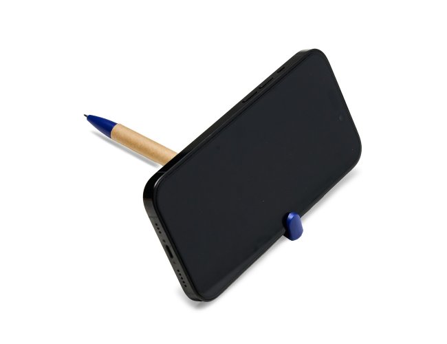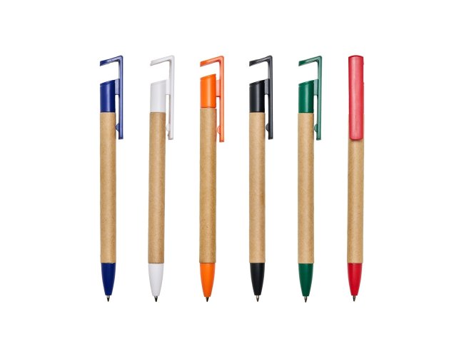 Caneta de papelão com suporte para celular, carga esferográfica azul 0,8 mm e acionamento por clique.