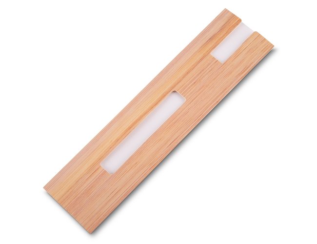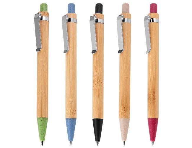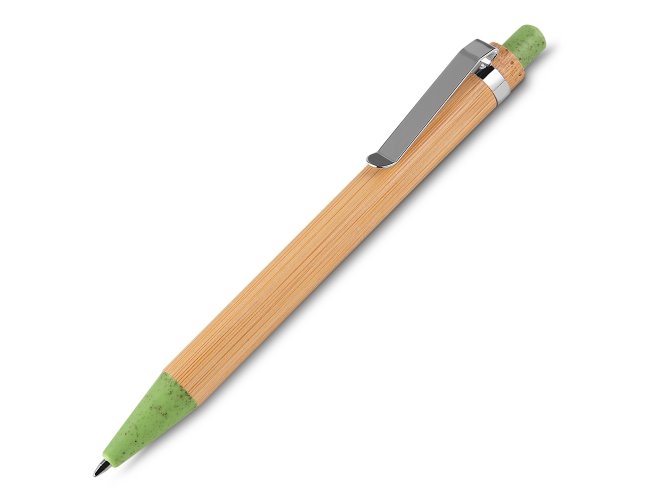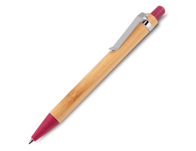 Conjunto caneta de bambu com estojo de papel. Carga esferográfica azul e acionamento por clique.