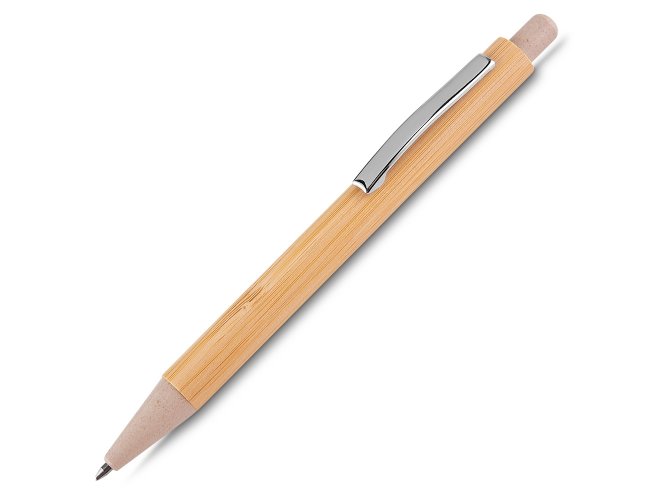 Conjunto caneta de bambu com estojo de papel. Carga esferográfica azul e acionamento por clique.