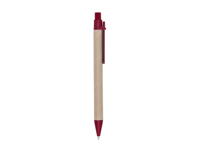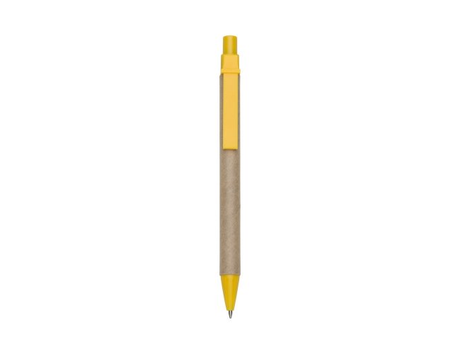 Caneta de papelão com detalhes plásticos, carga esferográfica azul 1.0 mm e acionamento por clique.