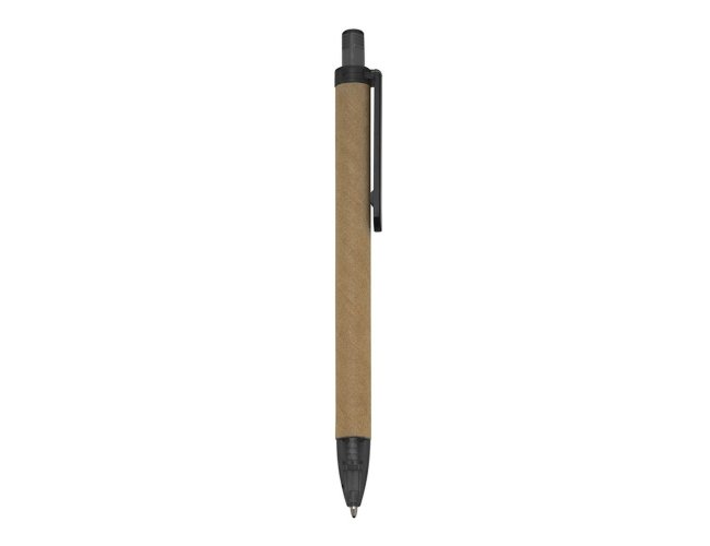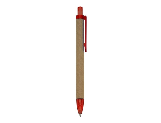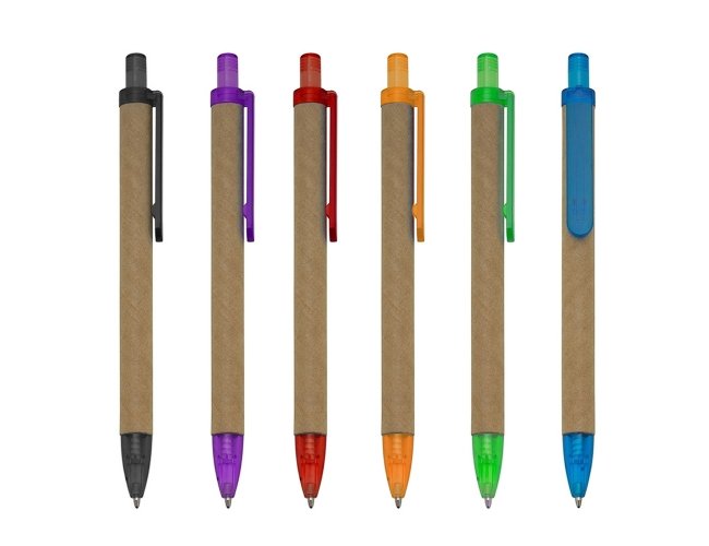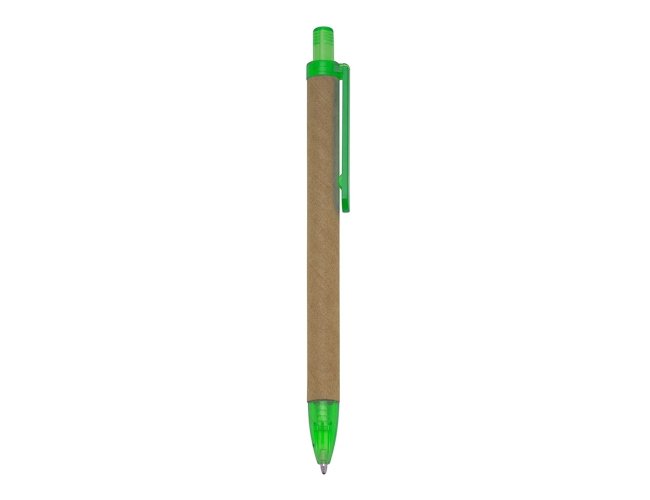 Caneta de papelão com detalhes plásticos translúcidos, carga esferográfica azul 1.0 mm e acionamento por clique.