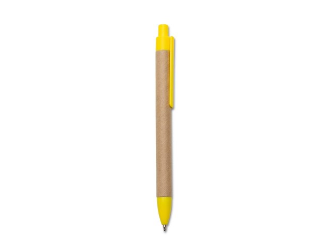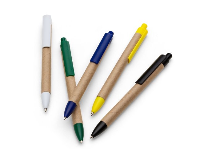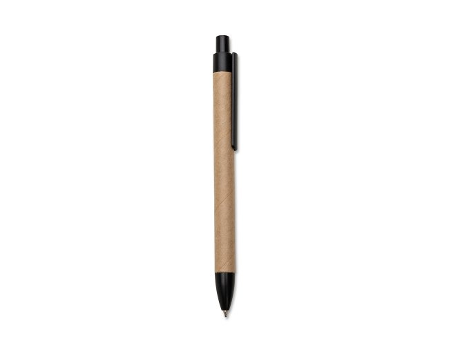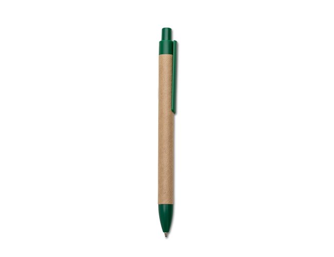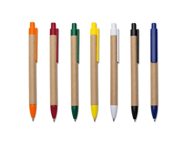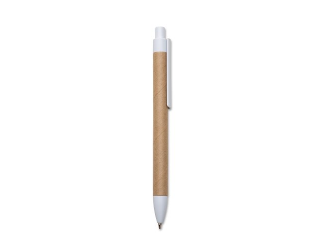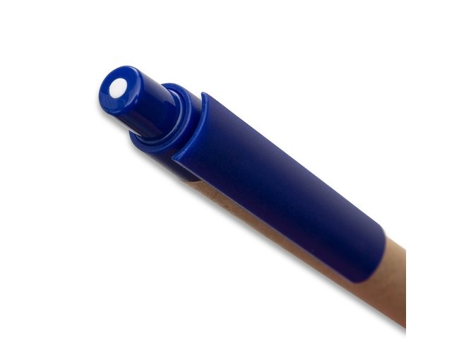 Caneta de papelão com detalhes plásticos, carga esferográfica azul 1.0 mm e acionamento por clique.