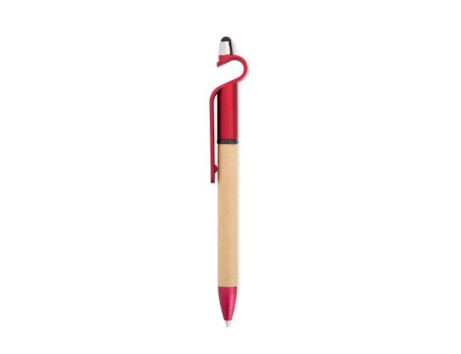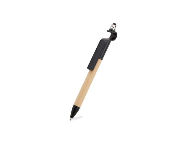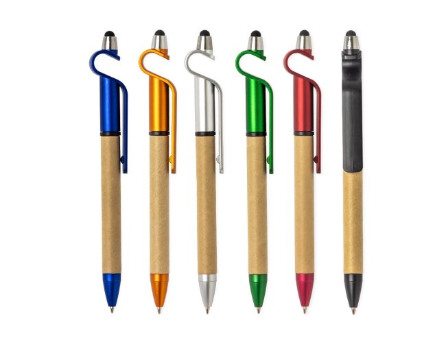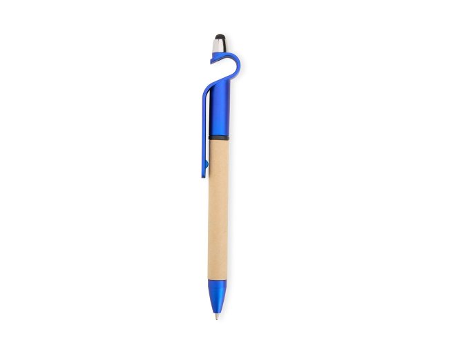 Caneta de papelão com detalhes plásticos, contém suporte para celular e touch screen. Carga esferográfica azul 1.0 mm e acionamento por rotação.
