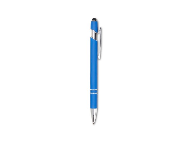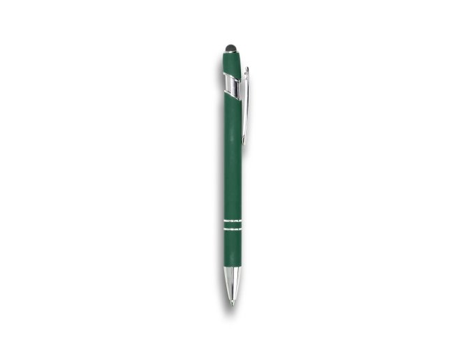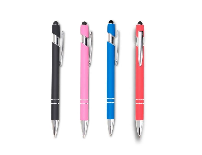 Caneta touch screen metálica com acabamento inteiramente emborrachado, carga esferográfica preta e acionamento por clique.