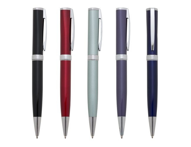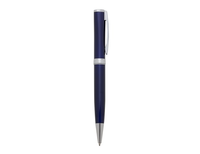 Caneta metálica com carga esferográfica azul 1.0 mm e acionamento por rotação.