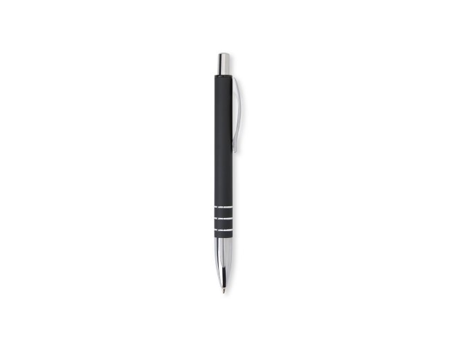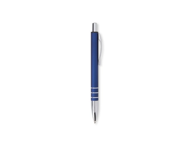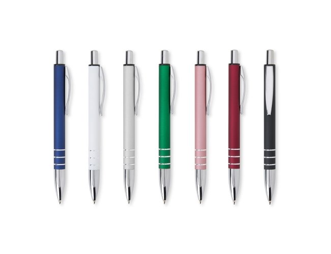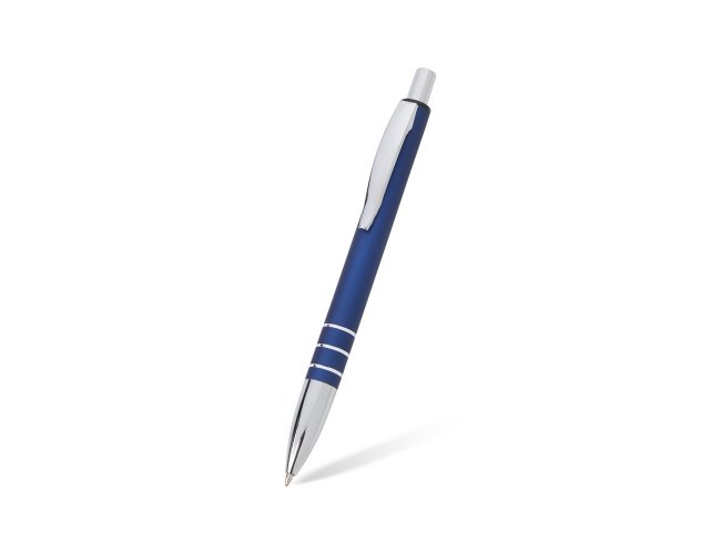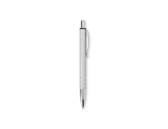 Caneta metálica com acabamento fosco, clipe metálico e ponteira plástica. Carga esferográfica azul 1.0mm e acionamento por clique.