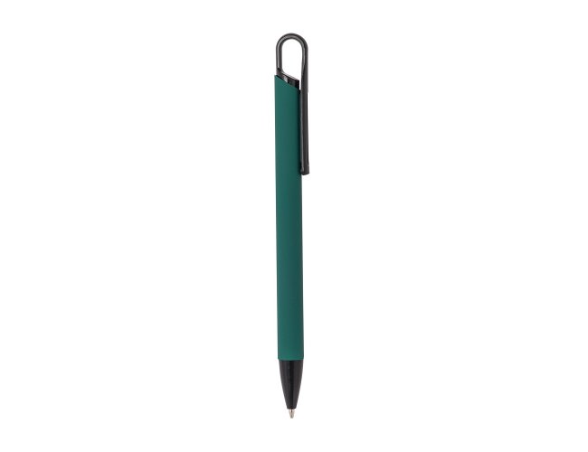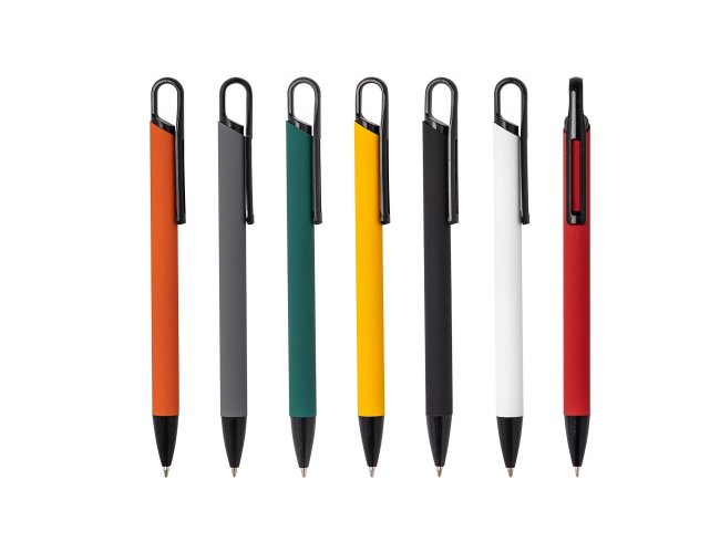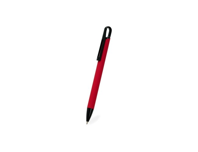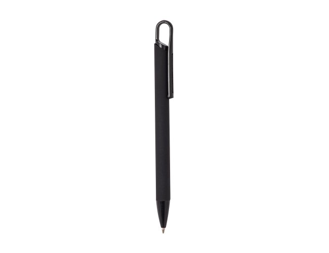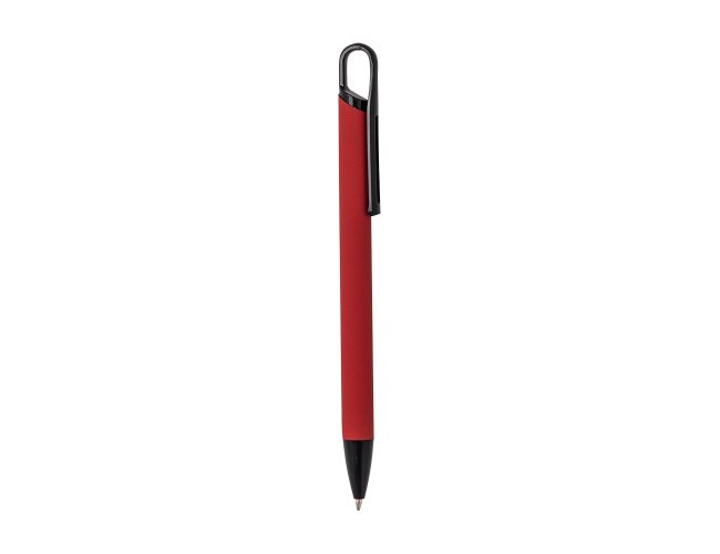 Caneta metálica com acabamento similar à borracha, clipe e ponteira plásticas, carga esferográfica azul 1.0mm e acionamento por clique.