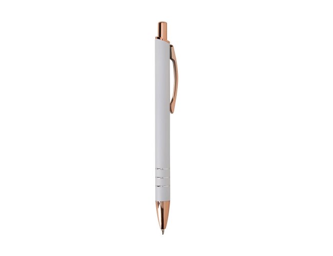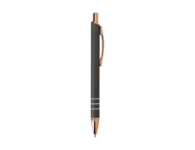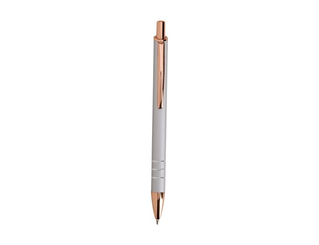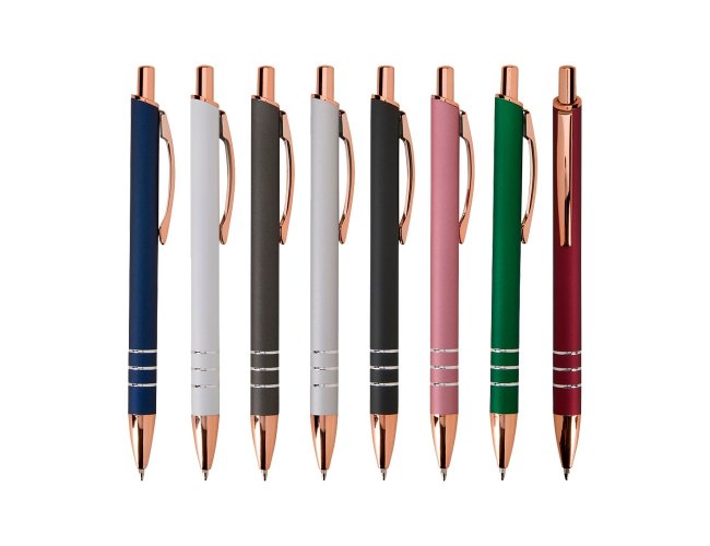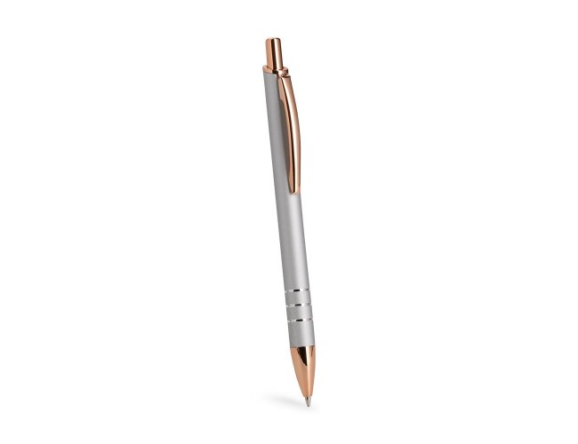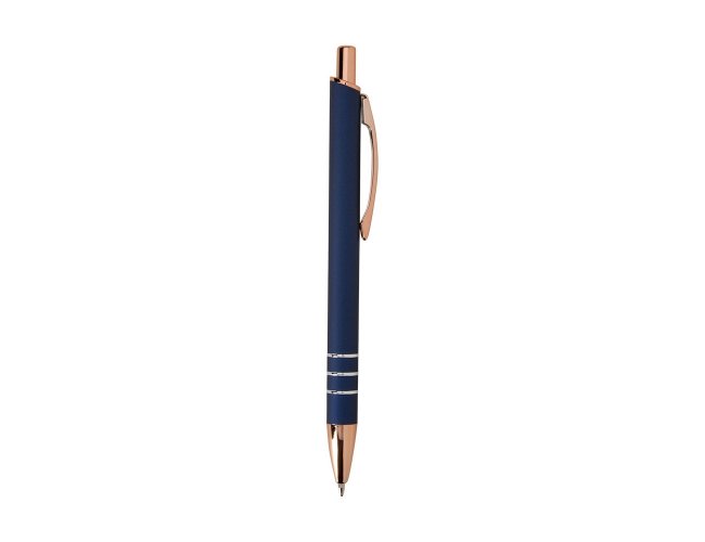 Caneta metálica com acionamento por clique e carga esferográfica azul de 1.0mm, uma combinação que oferece pegada leve para uma escrita mais precisa.
