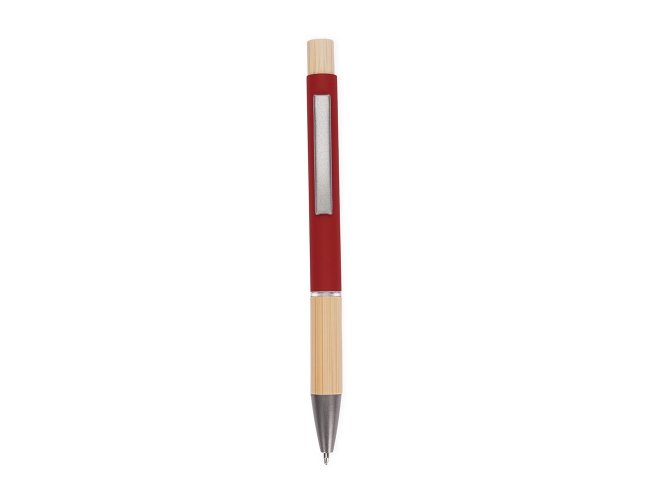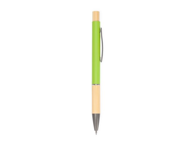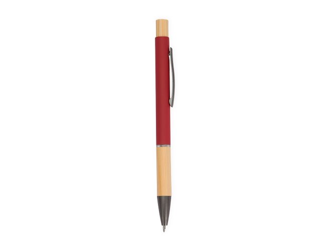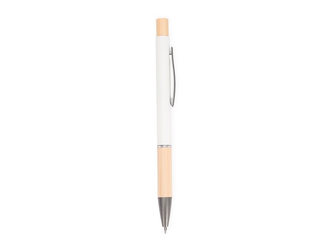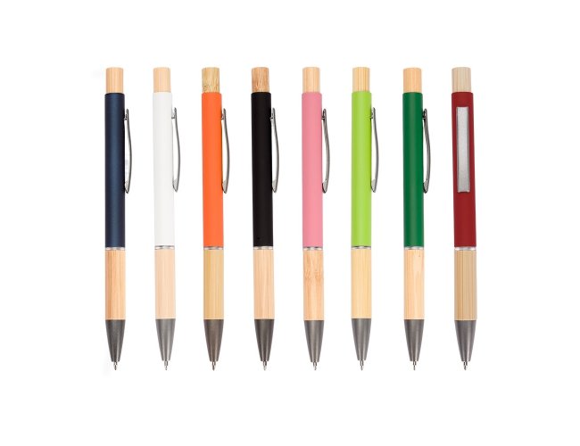 Caneta com carga esferográfica azul de 1.0mm. Apresenta corpo metálico, detalhes em bambu e acionamento por clique, oferecendo uma pegada leve para uma escrita precisa.