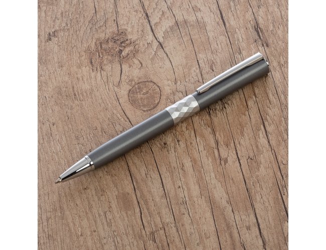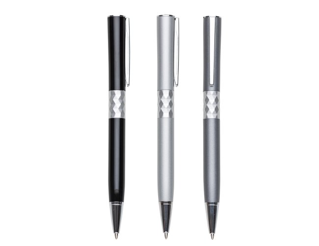 Caneta metálica com carga esferográfica azul e acionamento por rotação. OBS.: PEDIDO APENAS MÚLTIPLO DE 50 PEÇAS!