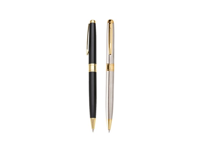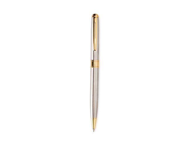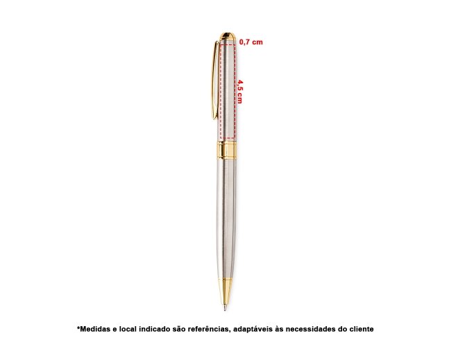 Caneta metálica com carga esferográfica azul e acionamento por rotação.
