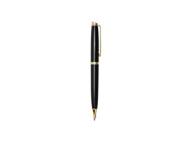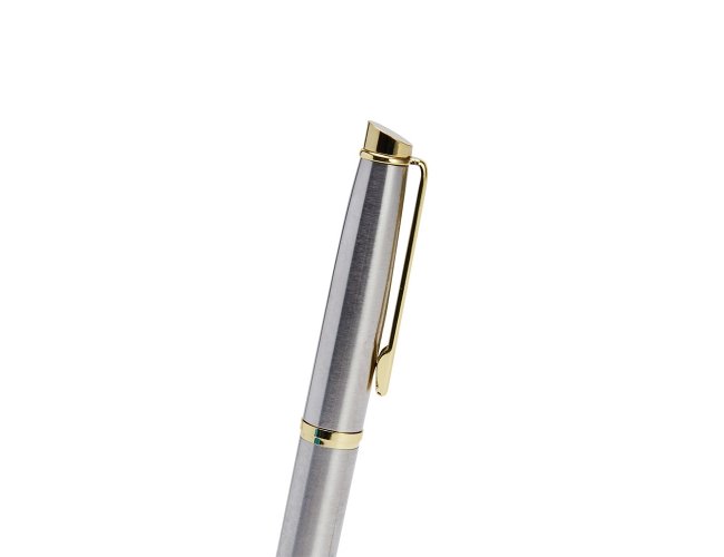 Caneta metálica com carga esferográfica azul 1mm e acionamento por rotação.