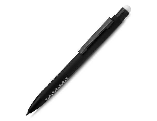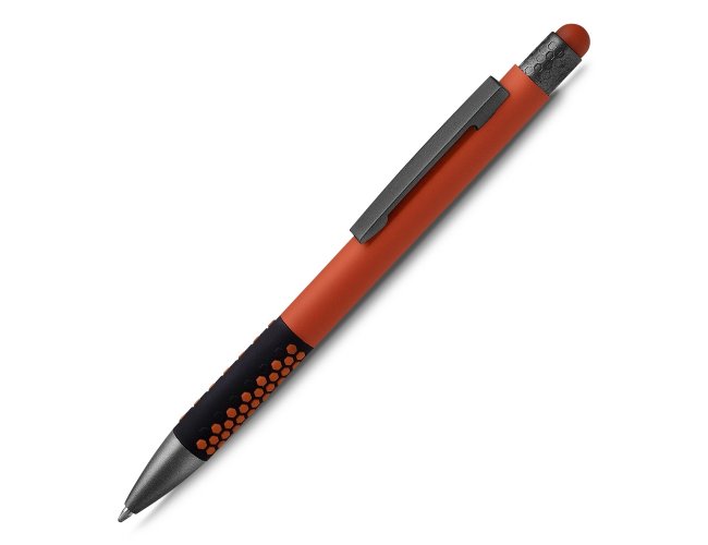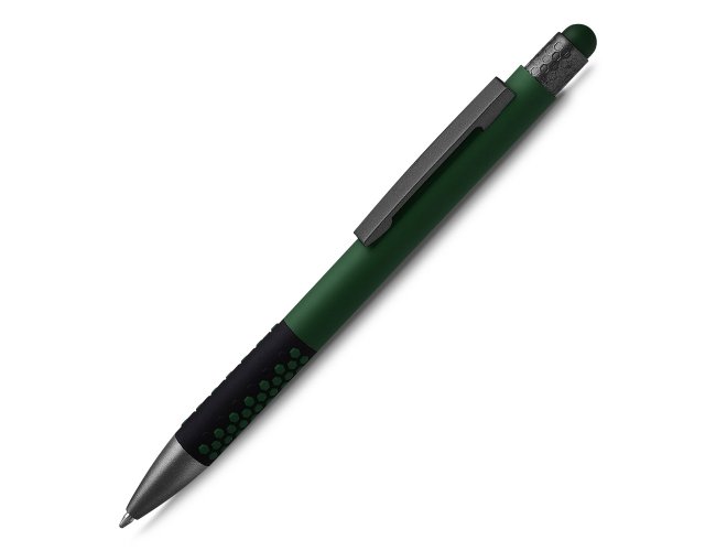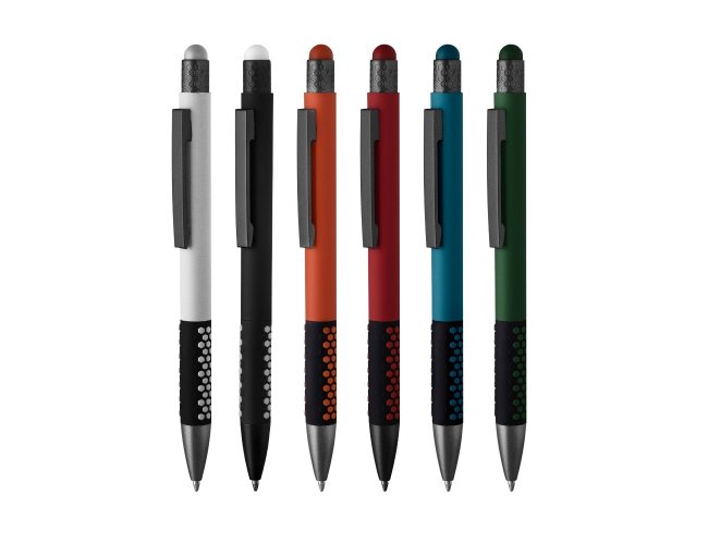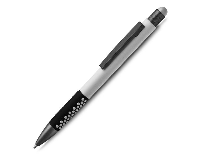 Caneta touch screen em metal com acabamento similar à borracha. Acionamento por clique e carga esferográfica azul 1.0mm.