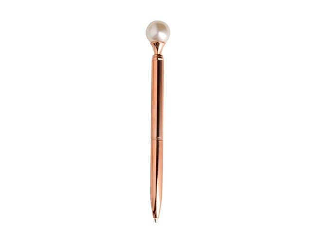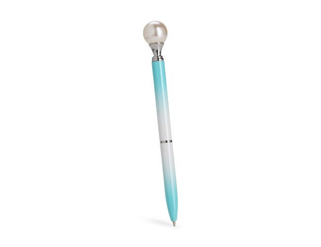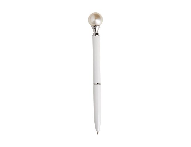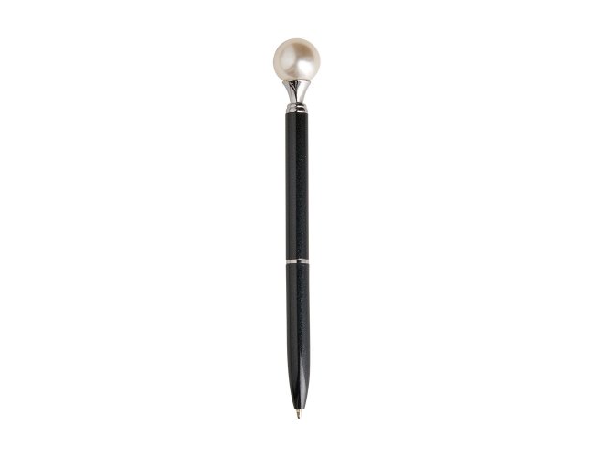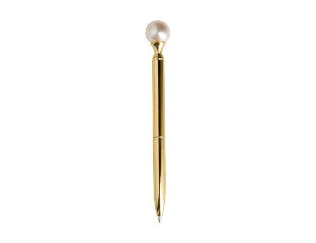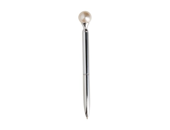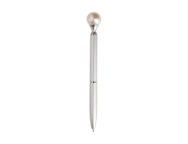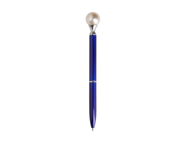 Caneta em metal com detalhe ornamental no formato de pérola. Possui acionamento em clique, destravamento ao pressionar a parte inferior do clipe e carga esferográfica azul de 1.0mm.