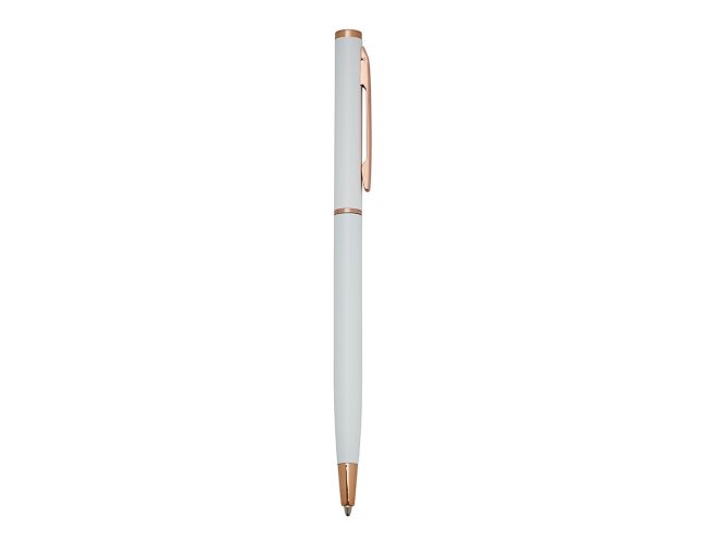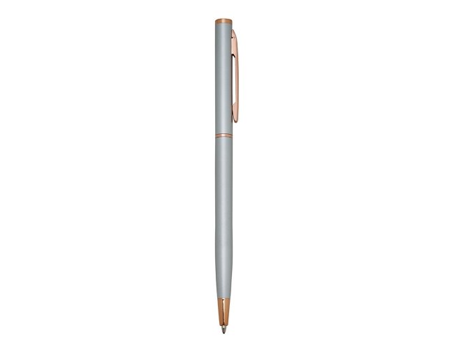 Caneta metálica com carga esferográfica azul 1.0 mm e acionamento por rotação.