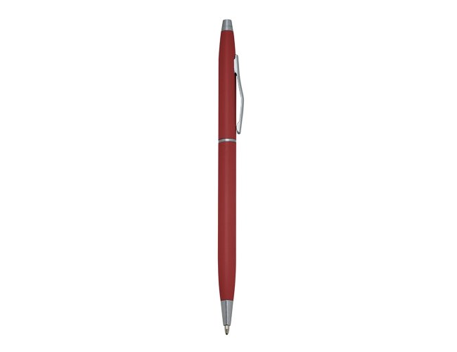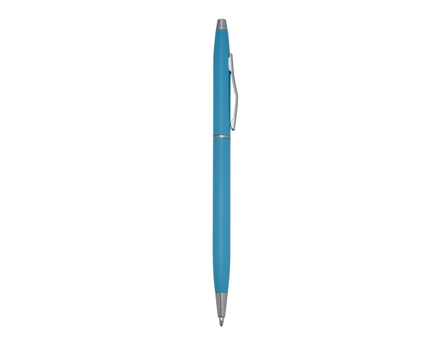 Caneta metálica com carga esferográfica azul 1.0 mm e acionamento por rotação.