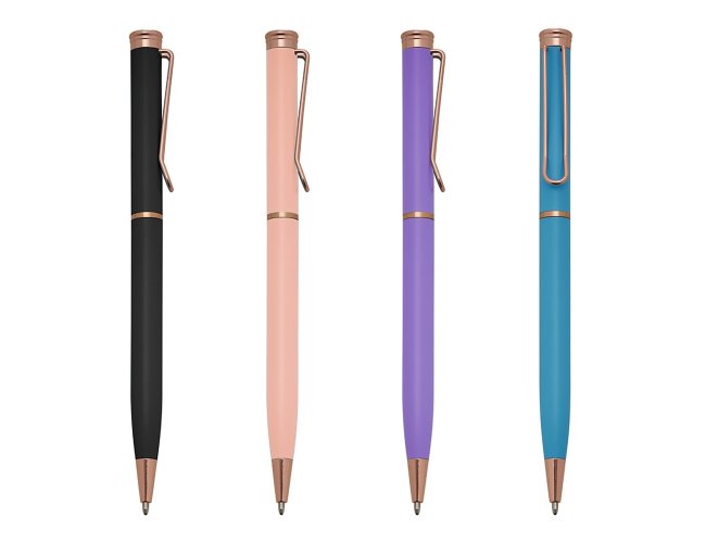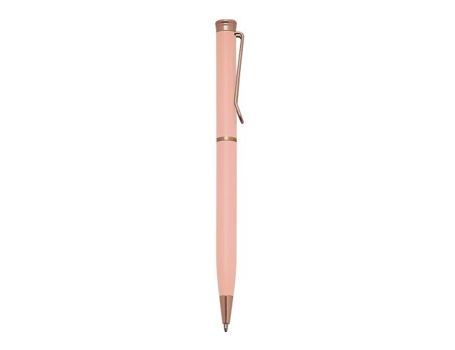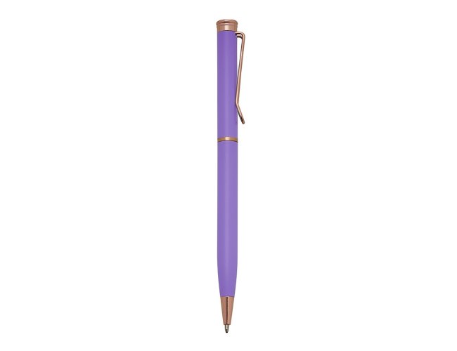 Caneta metálica com carga esferográfica azul 1.0 mm e acionamento por rotação.