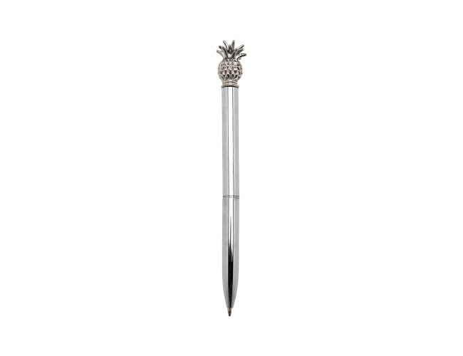 Caneta metálica com carga esferográfica azul e acionamento por rotação.