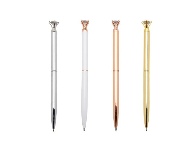 Caneta metálica com carga esferográfica azul e acionamento por rotação.