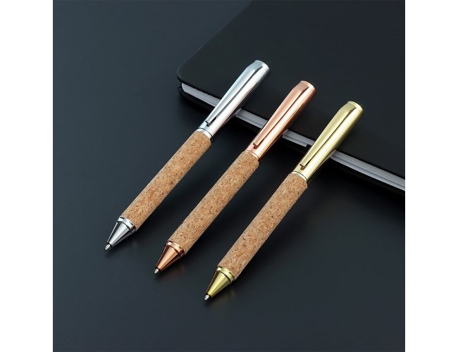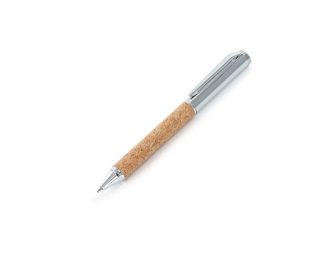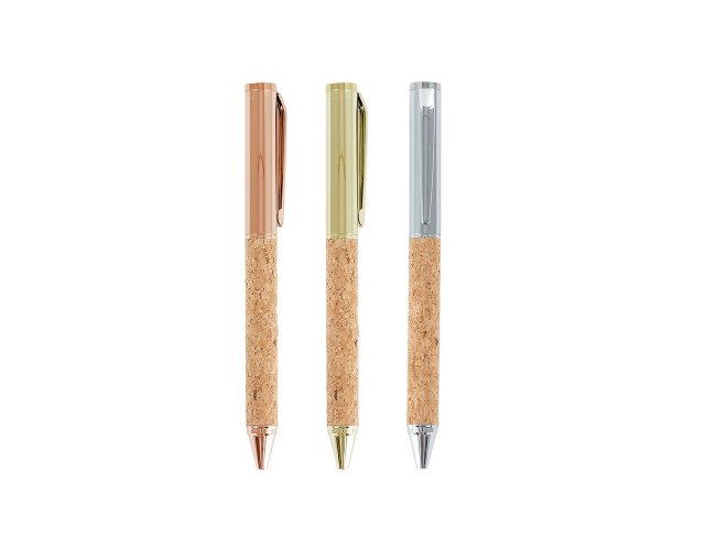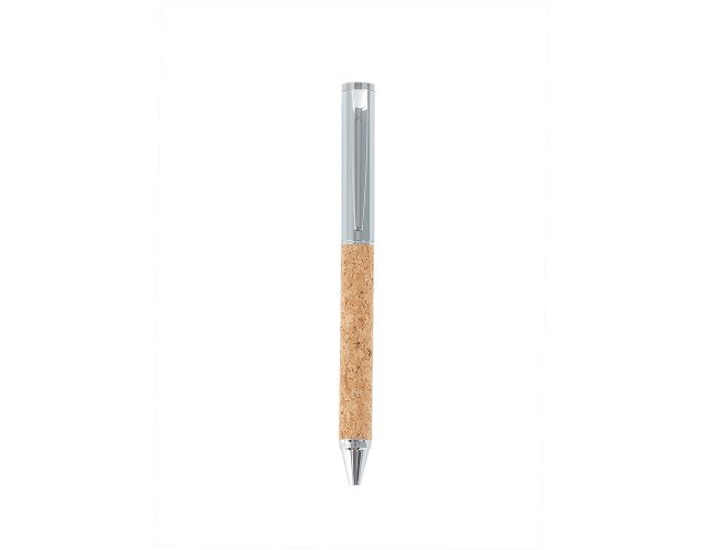 Caneta metálica com detalhe em cortiça, carga esferográfica azul 1.0mm e acionamento por rotação.