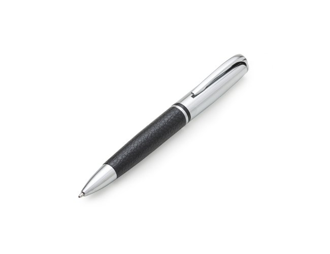 Caneta metálica com detalhe em couro sintético, carga esferográfica azul 1.0 mm e acionamento por rotação.