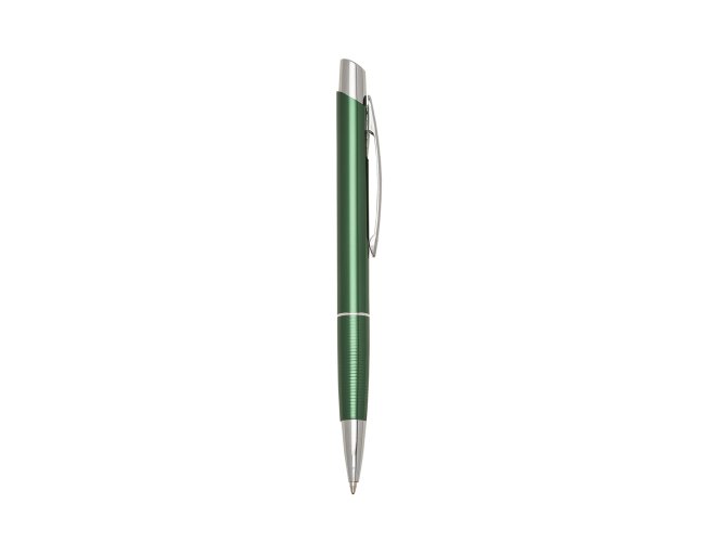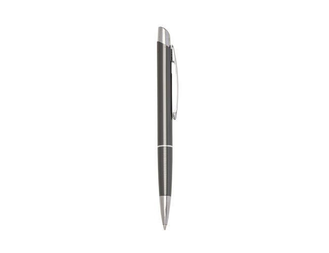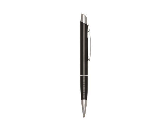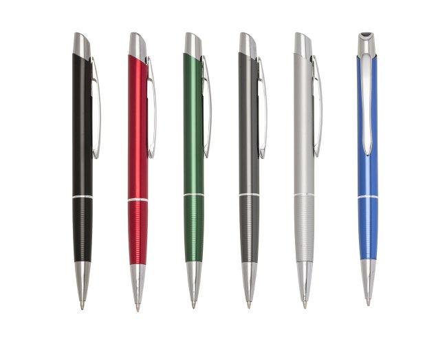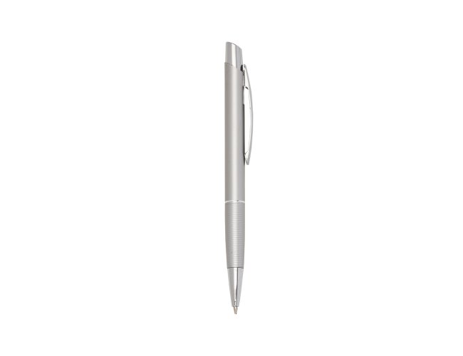 Caneta metálica com carga esferográfica azul 1.0 mm e acionamento por clique.