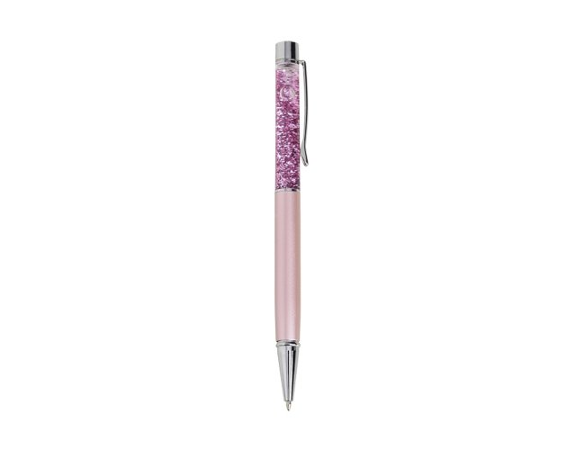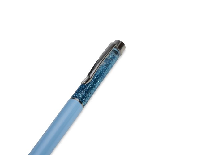 Caneta metálica com glitter, acionamento por rotação e carga esferográfica 1.0mm azul.