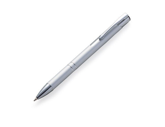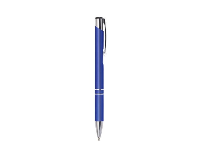 Caneta metálica com carga esferográfica azul e acionamento por clique.