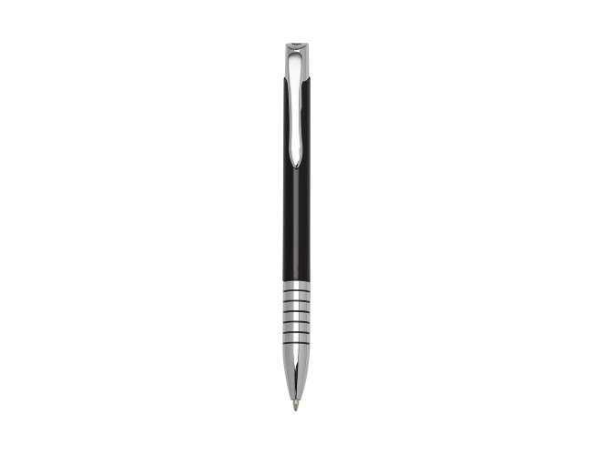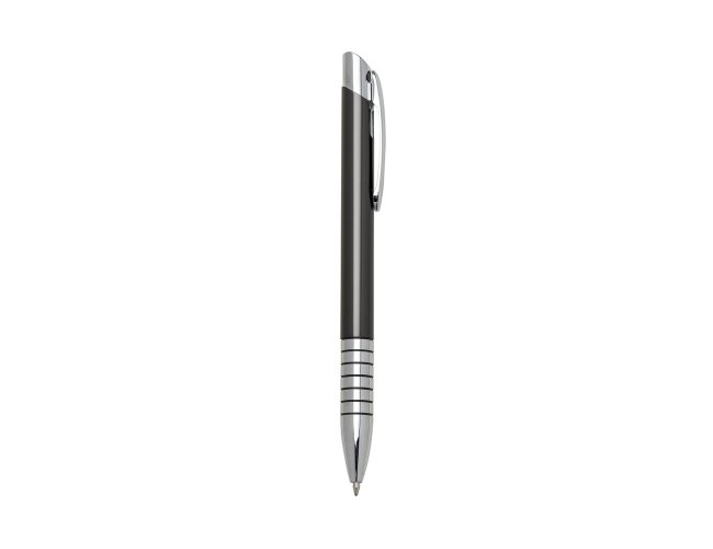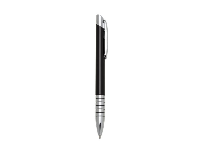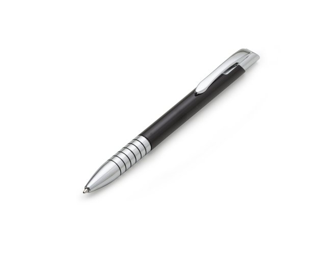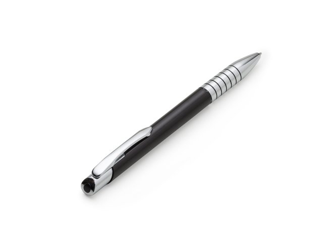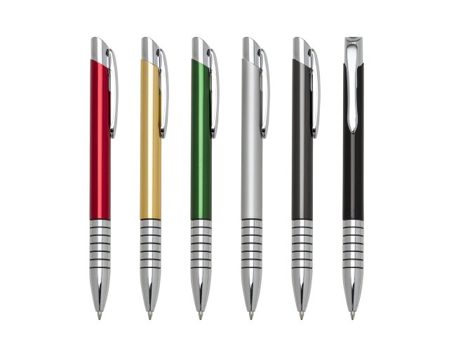 Caneta metálica com carga esferográfica azul e acionamento por clique.