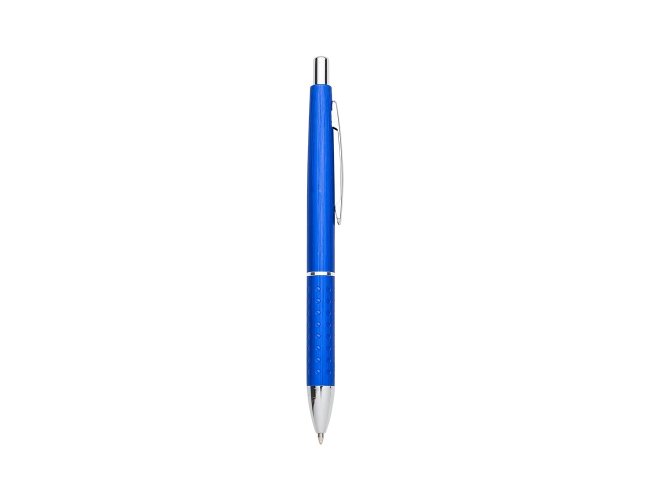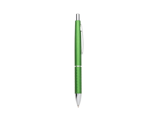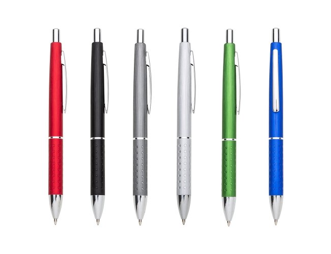 Caneta metálica com pintura escovada colorida, possui anel inferior prata e detalhes em relevo semelhante a strass. Acionamento por clique.