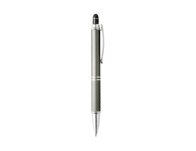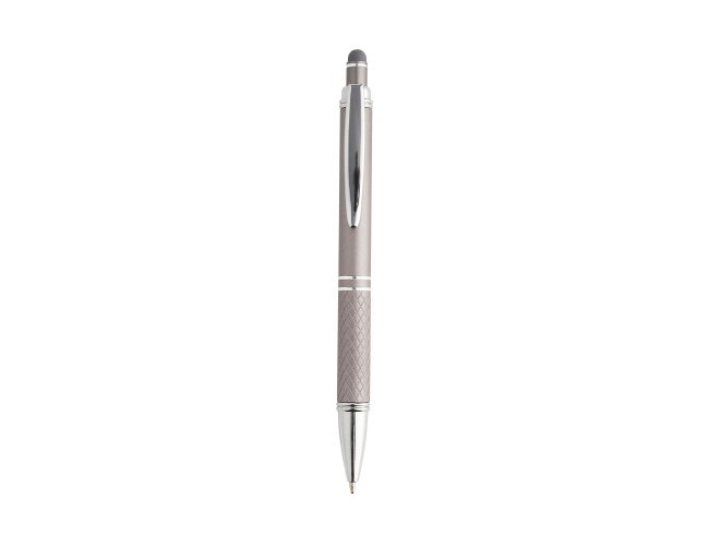 Caneta metálica touchscreen com parte inferior texturizada, acionamento por clique e carga esferográfica azul 1.0mm.