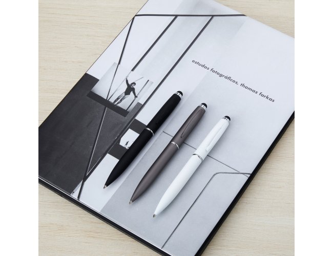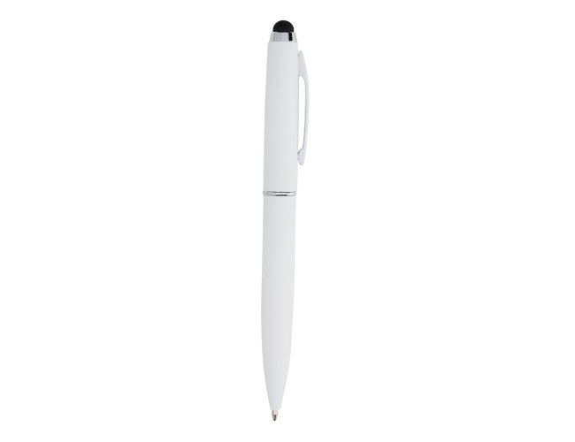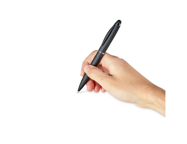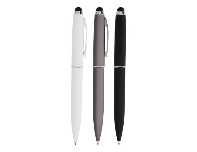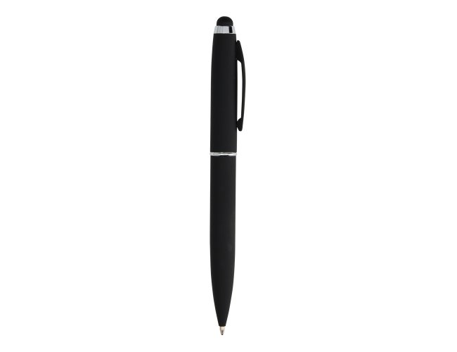 Caneta metálica touchscreen com acionamento por rotação e carga esferográfica azul 1mm.