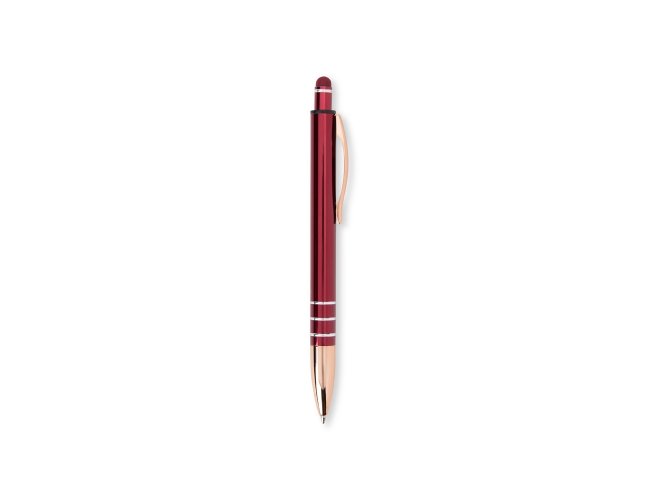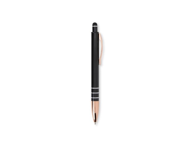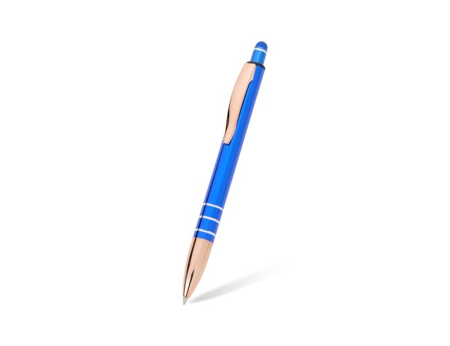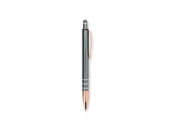 Caneta metálica com acionador touch, clipe metálico e ponteira plástica. Carga esferográfica azul 1.0mm e acionamento por clique.