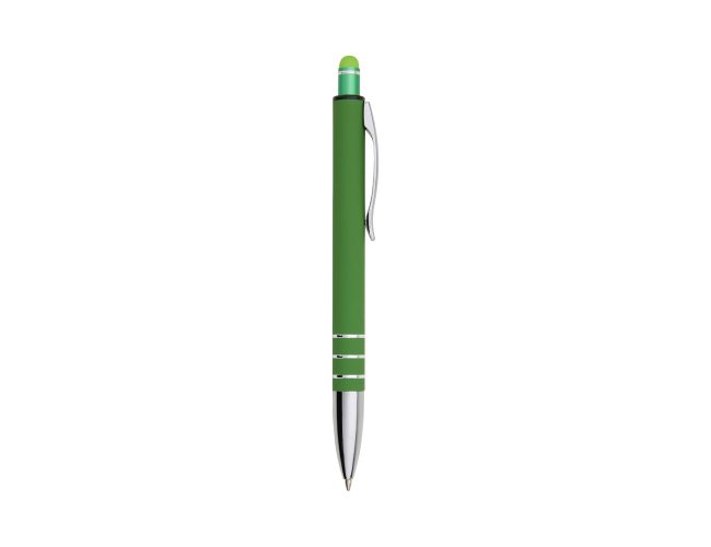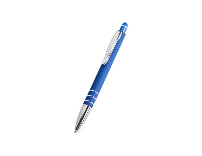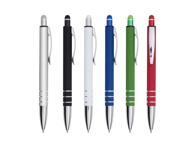 Caneta metálica touchscreen com acabamento emborrachado, acionamento por clique e carga esferográfica azul 1.0mm.