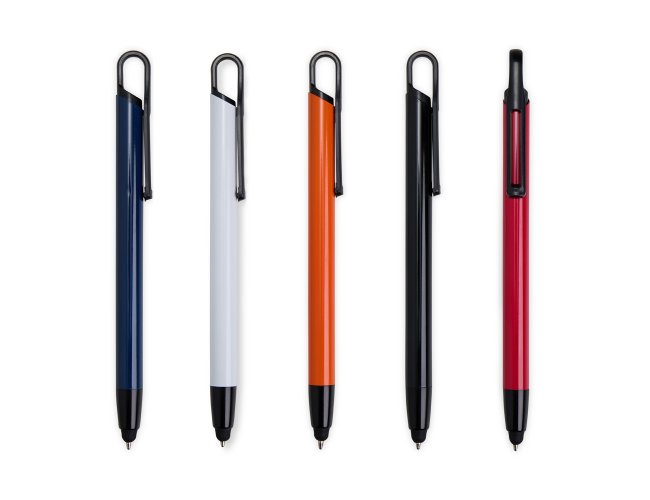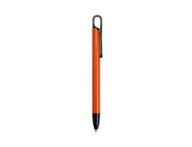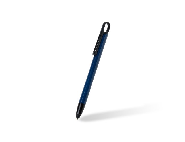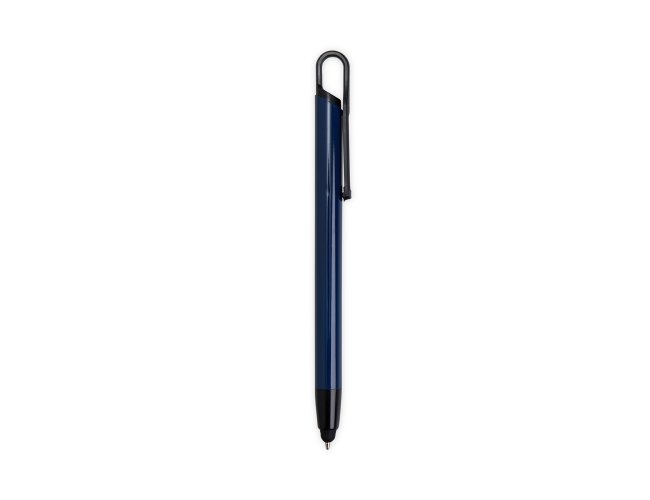 Caneta metálica com clipe plástico e ponteira touch, carga esferográfica azul 1.0mm e acionamento por clique.