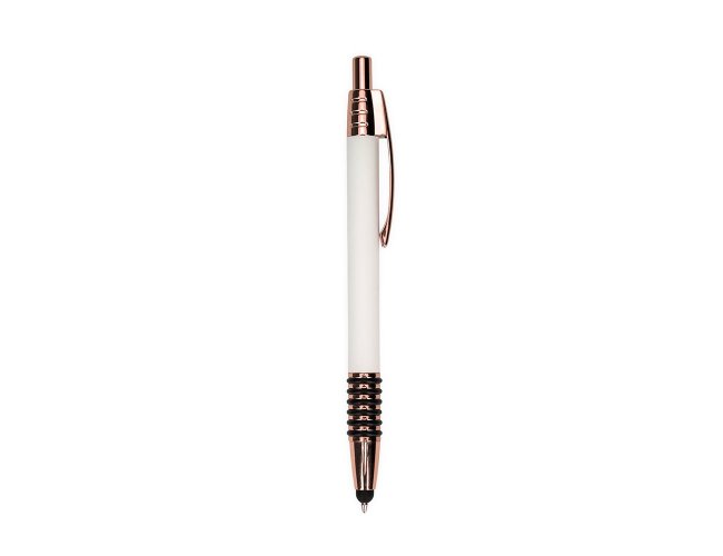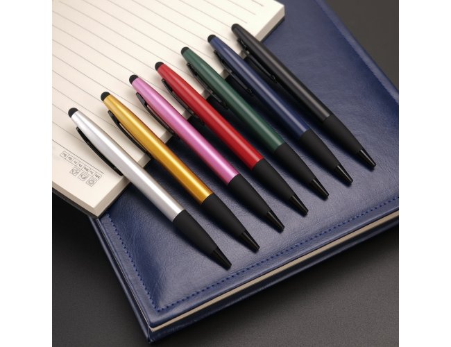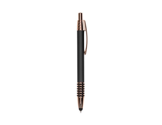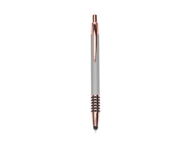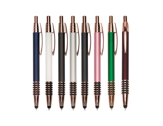 Caneta metálica com detalhes emborrachados no corpo para proporcionar mais conforto na escrita. Possui carga esferográfica azul de 1.0mm e acionamento por clique. Conta com ponteira touch para interação com dispositivos de tela sensível ao toque.