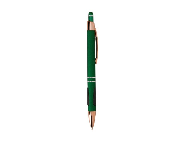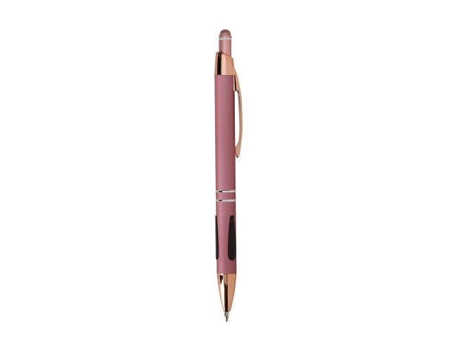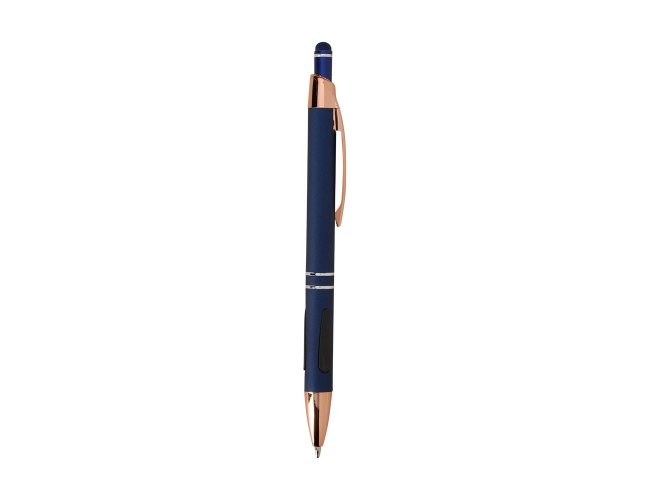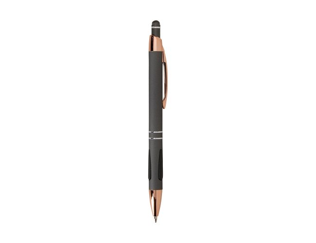 Caneta em metal com detalhes emborrachados, carga esferográfica azul de 1.0mm e acionamento por clique com acabamento emborrachado que permite seu uso como uma caneta touch para interação com dispositivos de tela sensível ao toque.