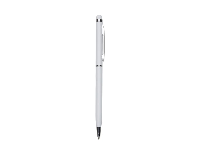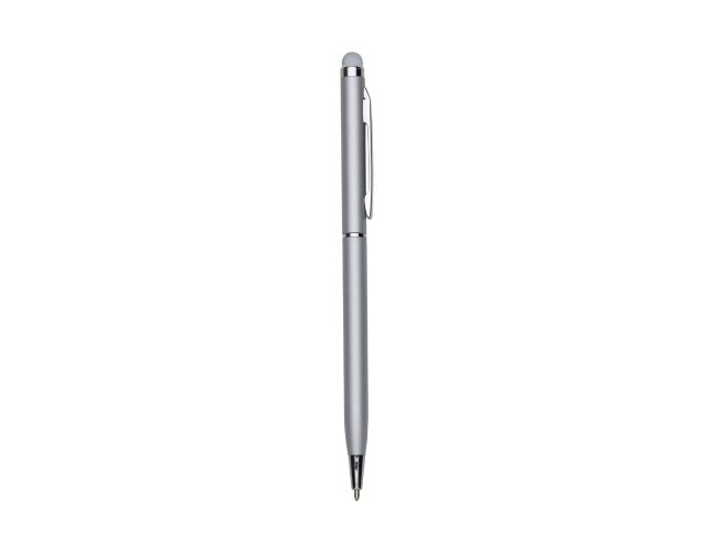 Caneta metálica com touch screen, carga esferográfica azul 1.0 mm e acionamento por rotação.