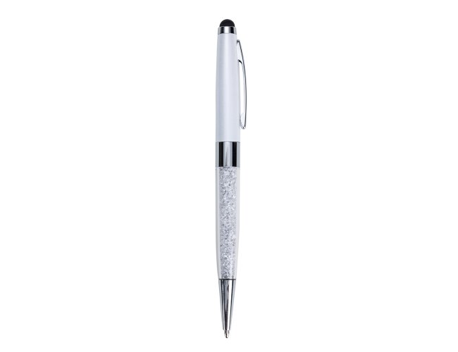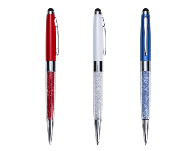 Caneta metálica com touch screen e detalhes em cristal, carga esferográfica azul e acionamento por rotação. OBS.: PEDIDO APENAS MÚLTIPLO DE 50 PEÇAS!