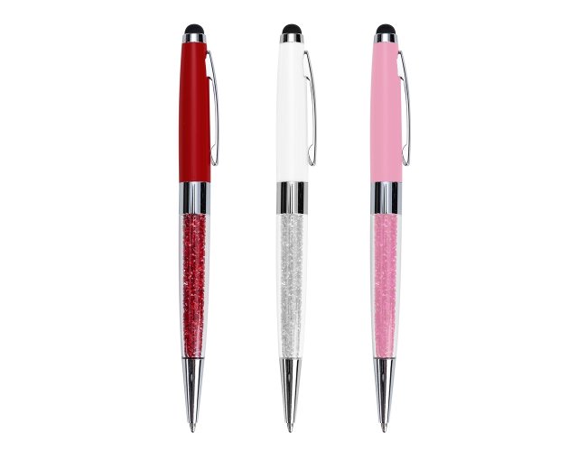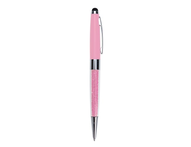Caneta metálica com touch screen e detalhes em cristal, carga esferográfica azul e acionamento por rotação.