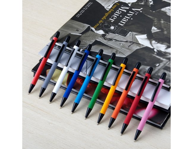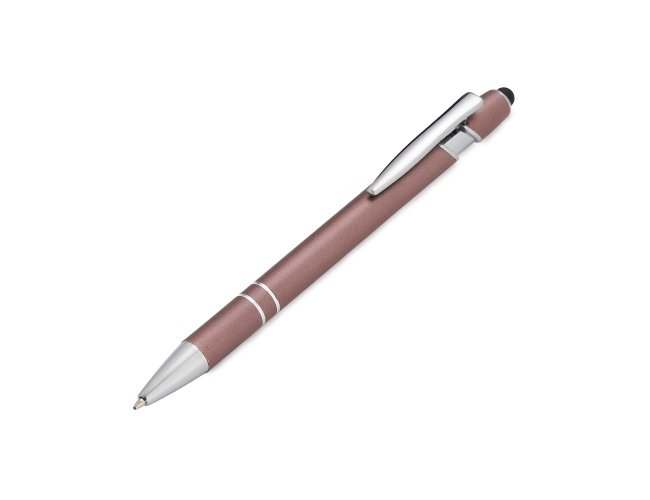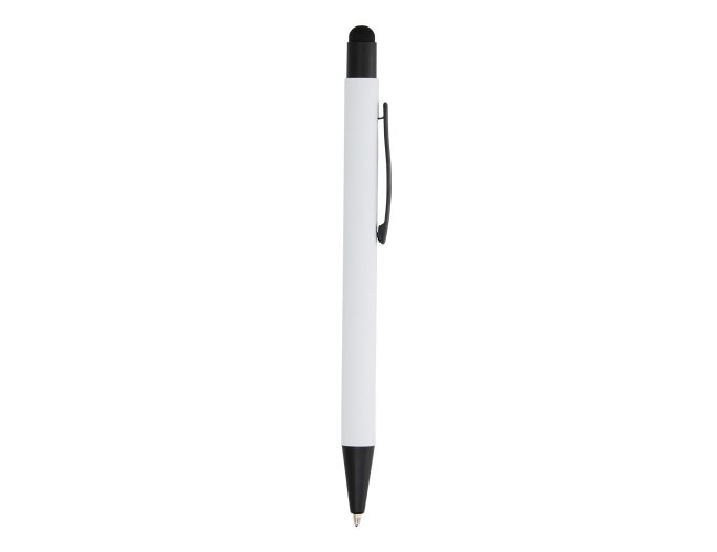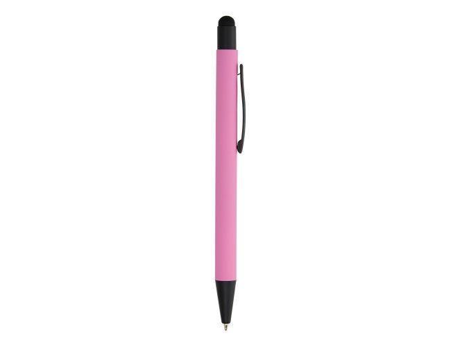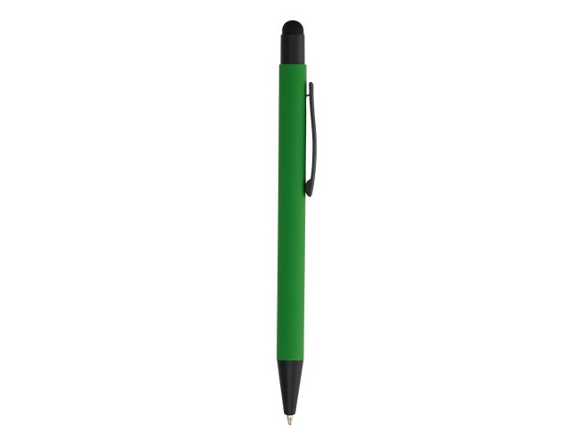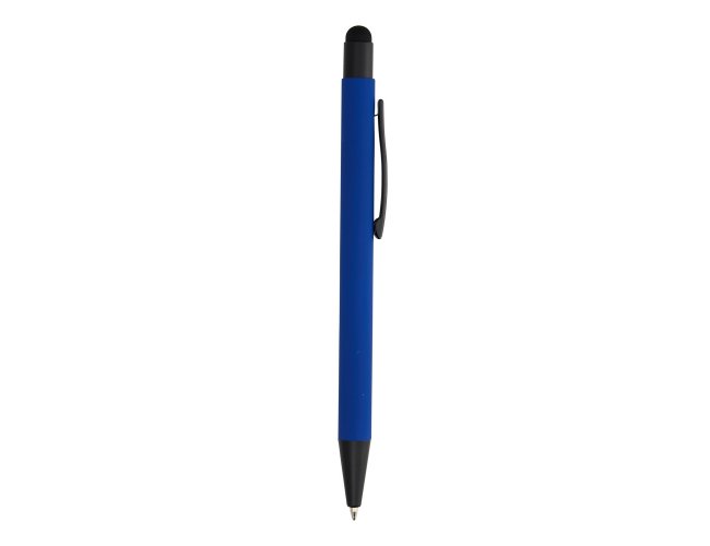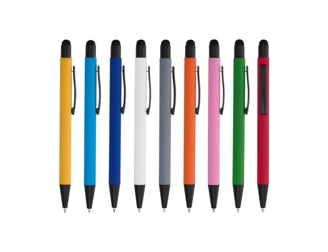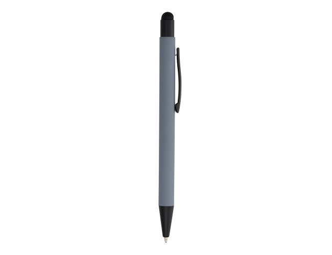 Caneta metálica touchscreen com acabamento emborrachado, acionamento por clique e carga esferográfica azul 1.0mm.