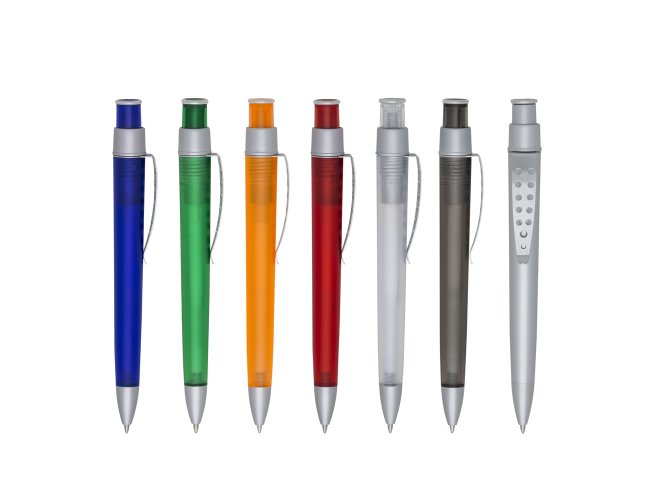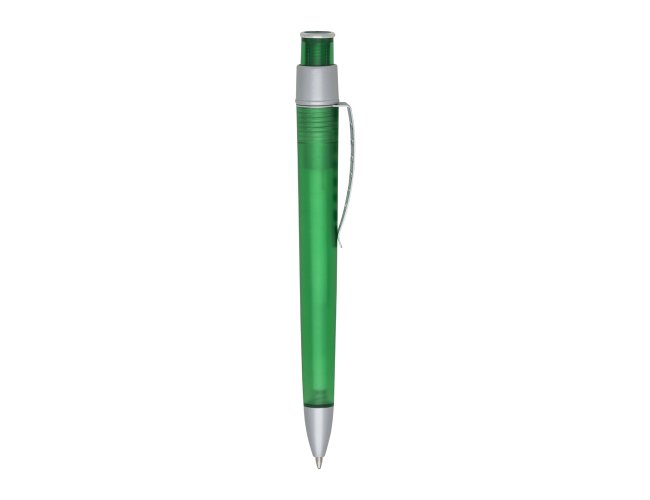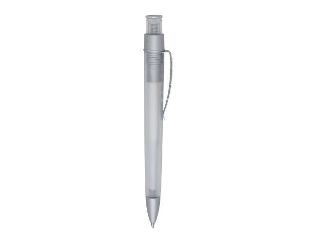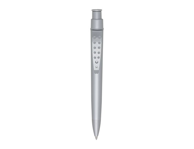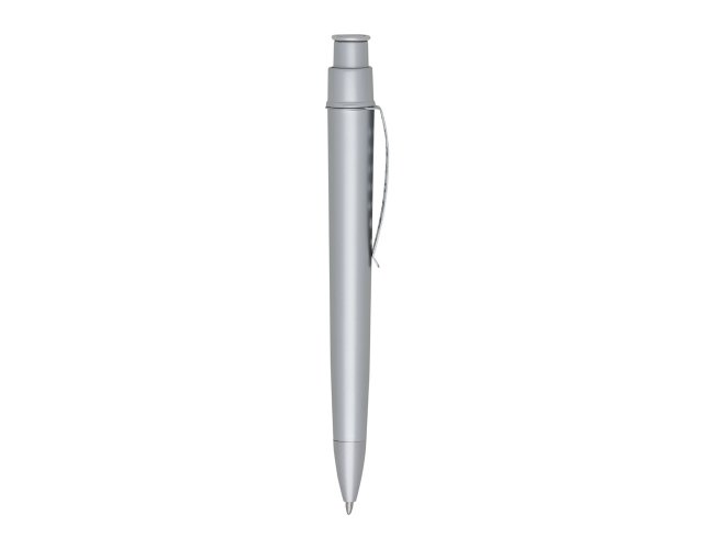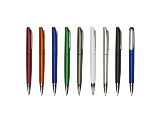 Caneta plástica com clip metálico vazado, carga esferográfica azul 1.0mm e acionamento por clique.
